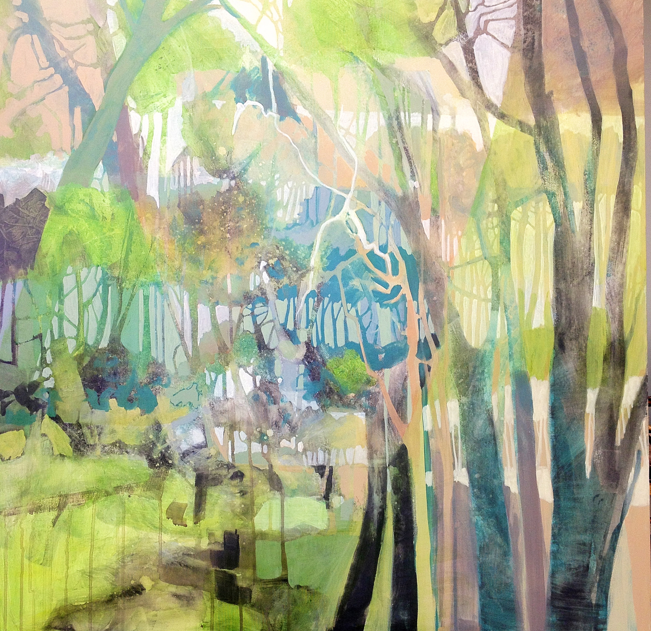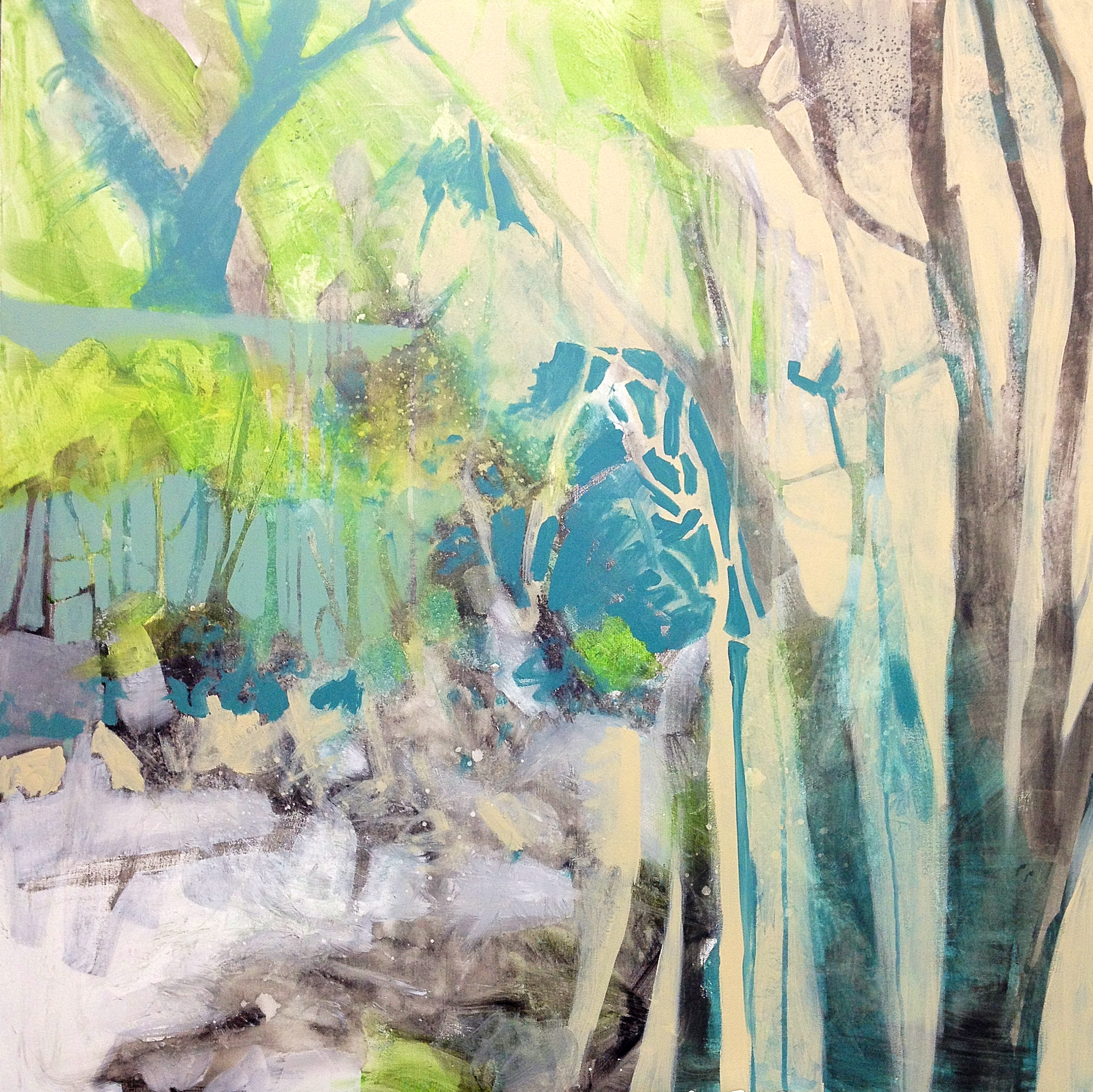 Another largish (36″X36″) painting begun. The earlier Evolution of a Painting sequence was my first time to do that type of set-by-step documentation of a piece, and I found it to be fun and quite helpful, so here begins another. What seems to be happening here is one of those “finding order” processes. The first step was to create a basically chaotic surface on which to work, find or create some images, then find or create some order within that chaos. It is still early in the process, so I haven’t settled on anything as yet, just enjoying the excitement of the exploration.