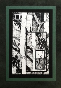 For these pieces, I began with a pen and ink drawing of trees on the shore of Lake Superior. I had the drawing reproduced, then cut, pasted, drew on, and reconfigured the elements to create new compositions on 5″x 7″ boards. Very fun and very relaxing. These are just a few of the ones I have completed thus far, with plans to do more, as each one suggests ideas for another.