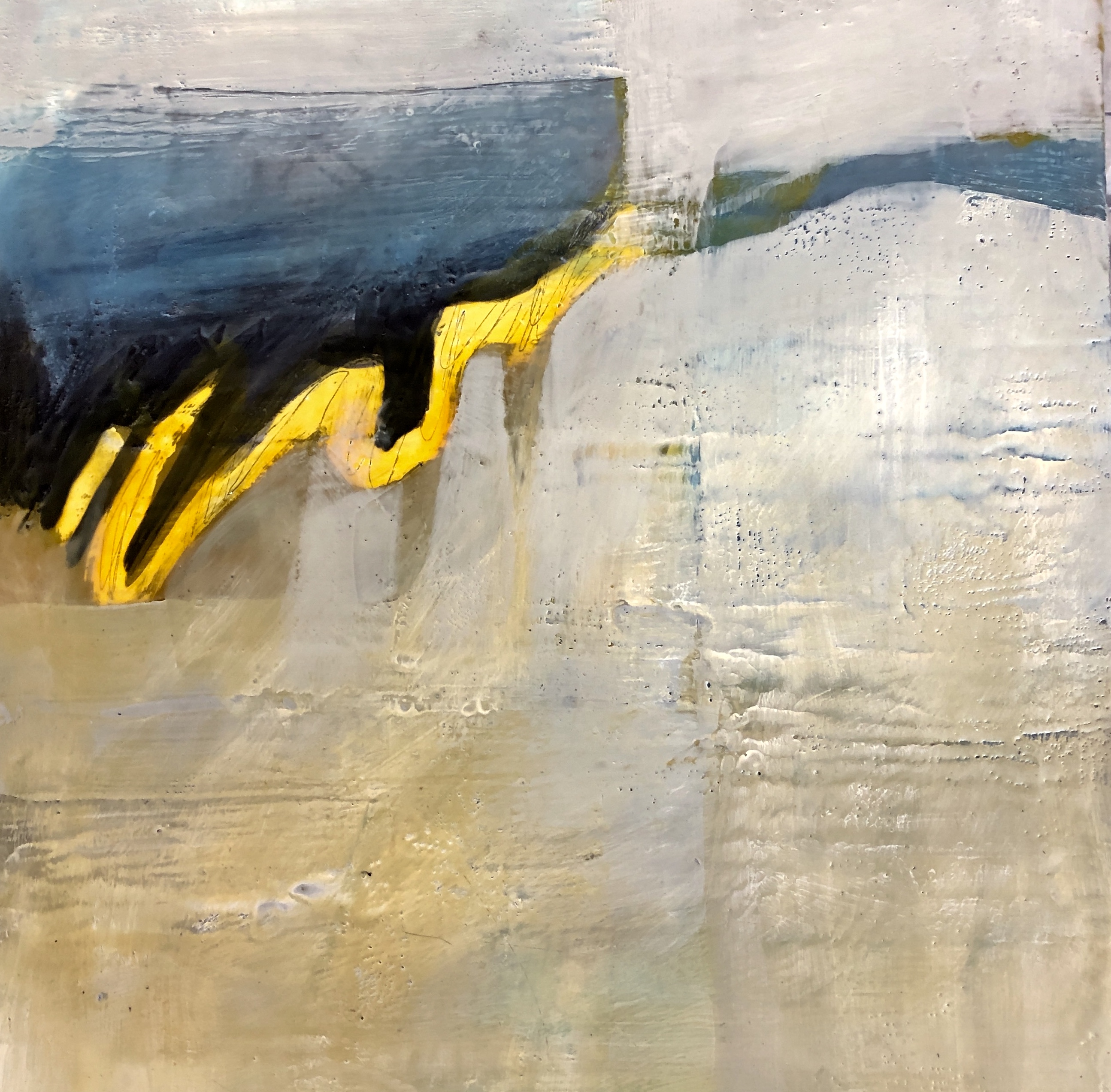 It is a fascinating process, but in 5 days I was primarily consumed with trying to master the process/techniques of working with hot wax. I made some progress, but have a LONG, LONG way to go. The following are in progress experiments which I hope to complete this Fall (once I set up an area of my own studio where I can work with the encaustic materials). Each piece is 12″ x 12″.