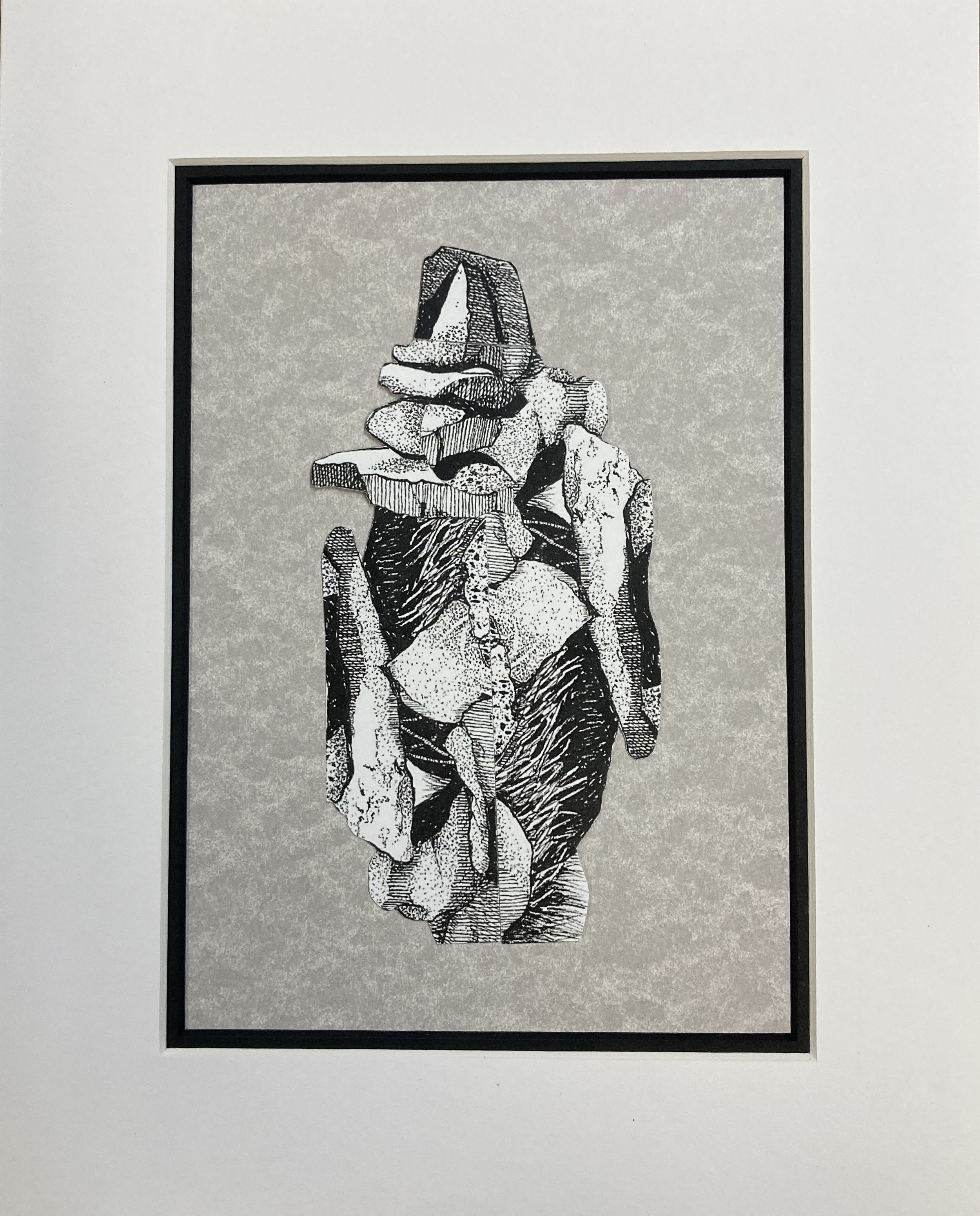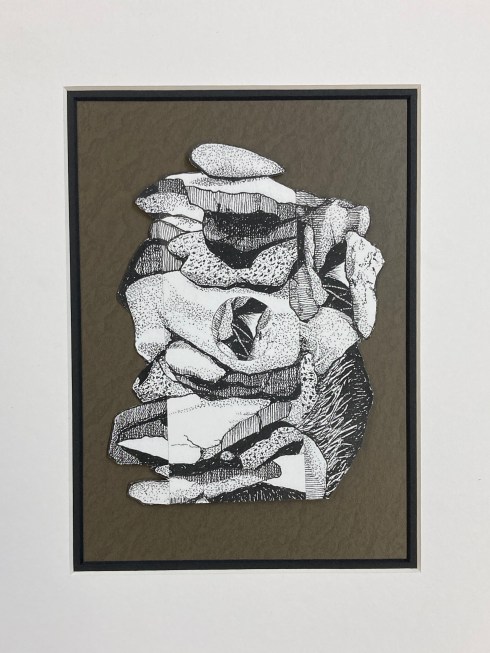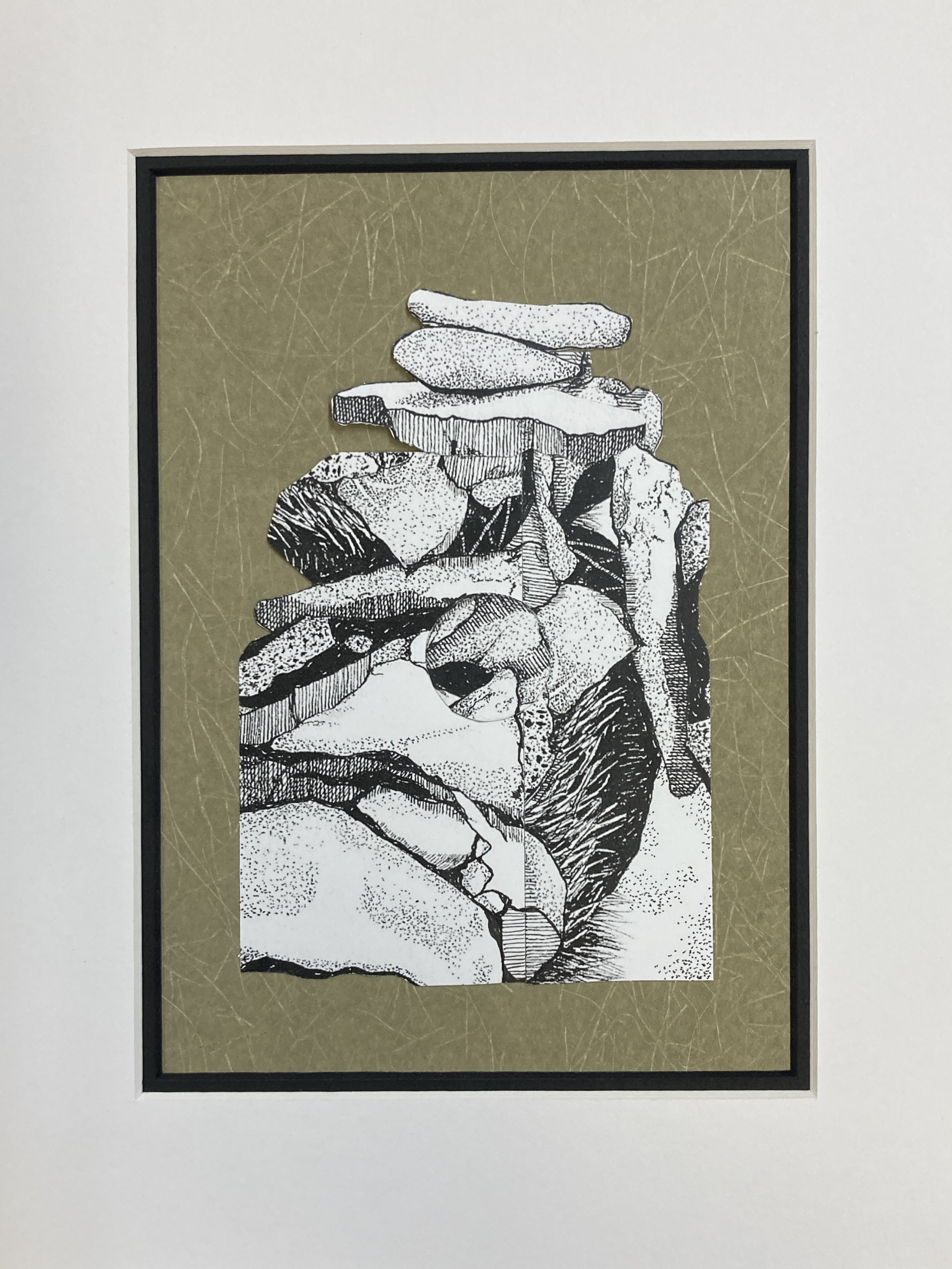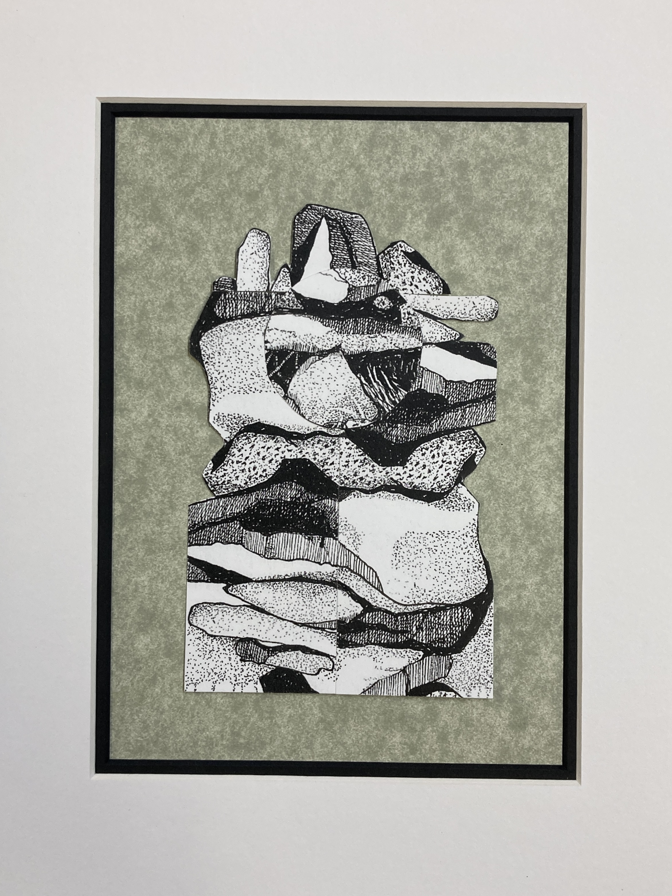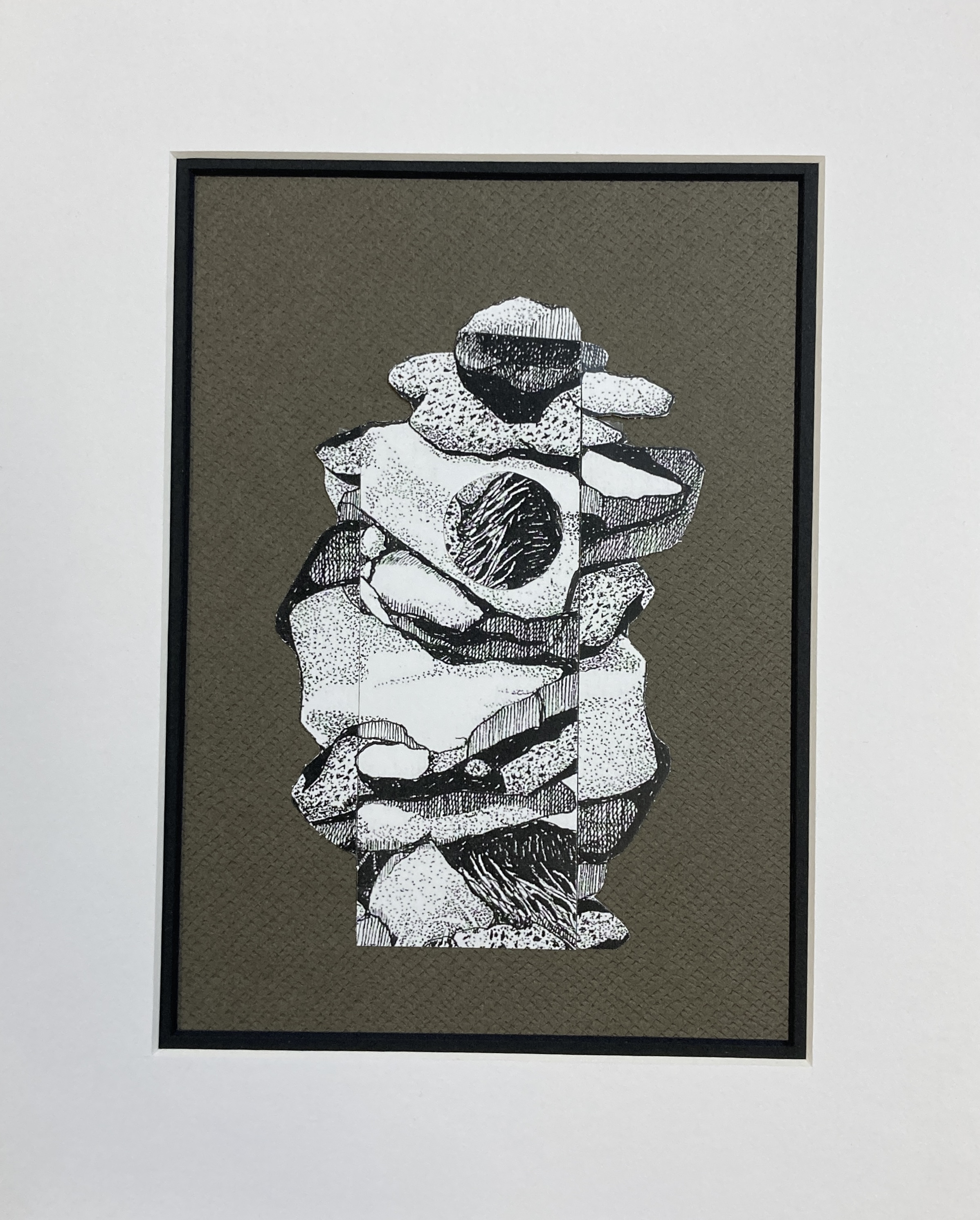 This series was created by taking a drawing I made of an inuksuk (stacked stones), reproducing it, then cutting it apart and reassembling/collaging into new configurations. I then added additional pen and ink drawing. Pure play. Each is matted to 8″x 10″.