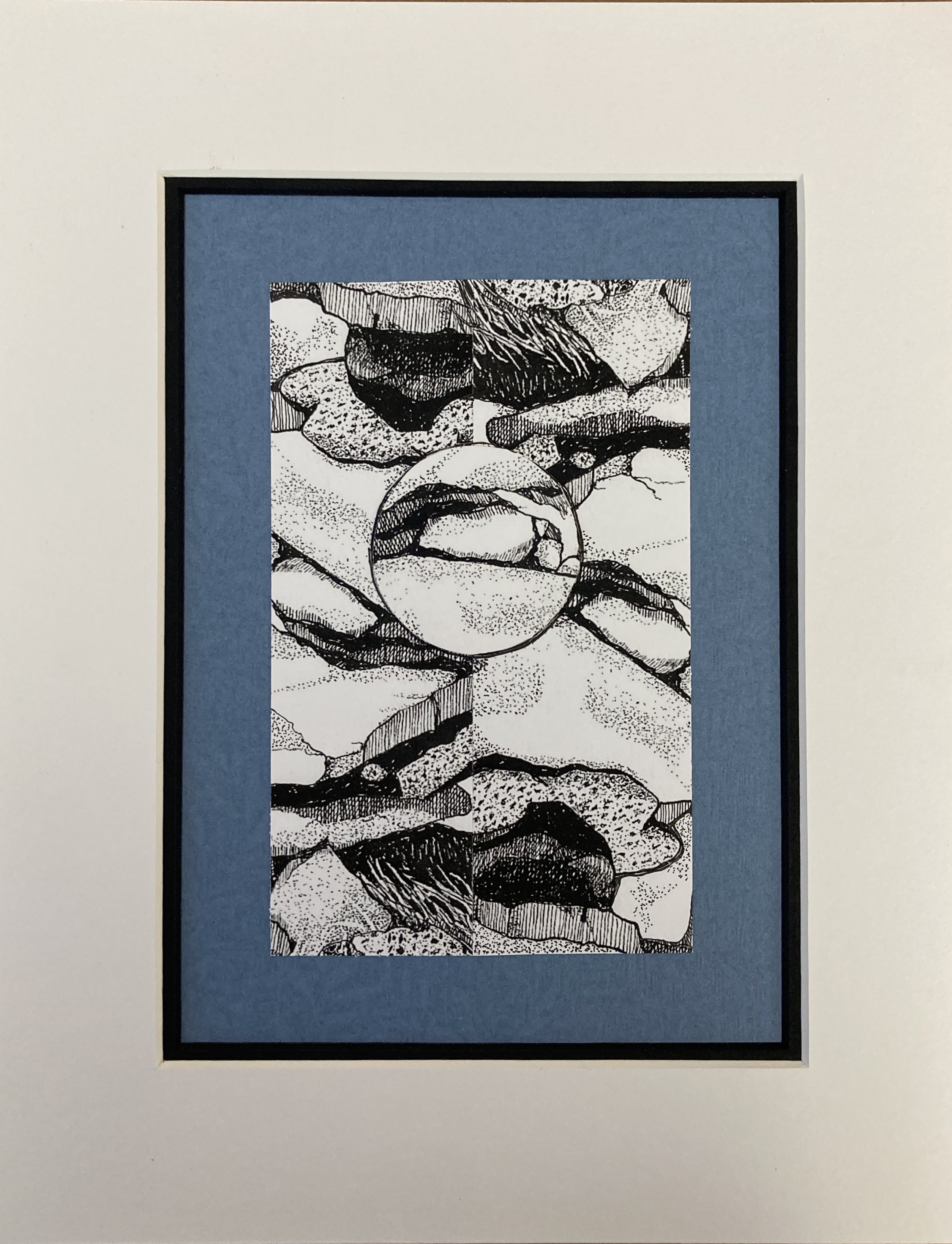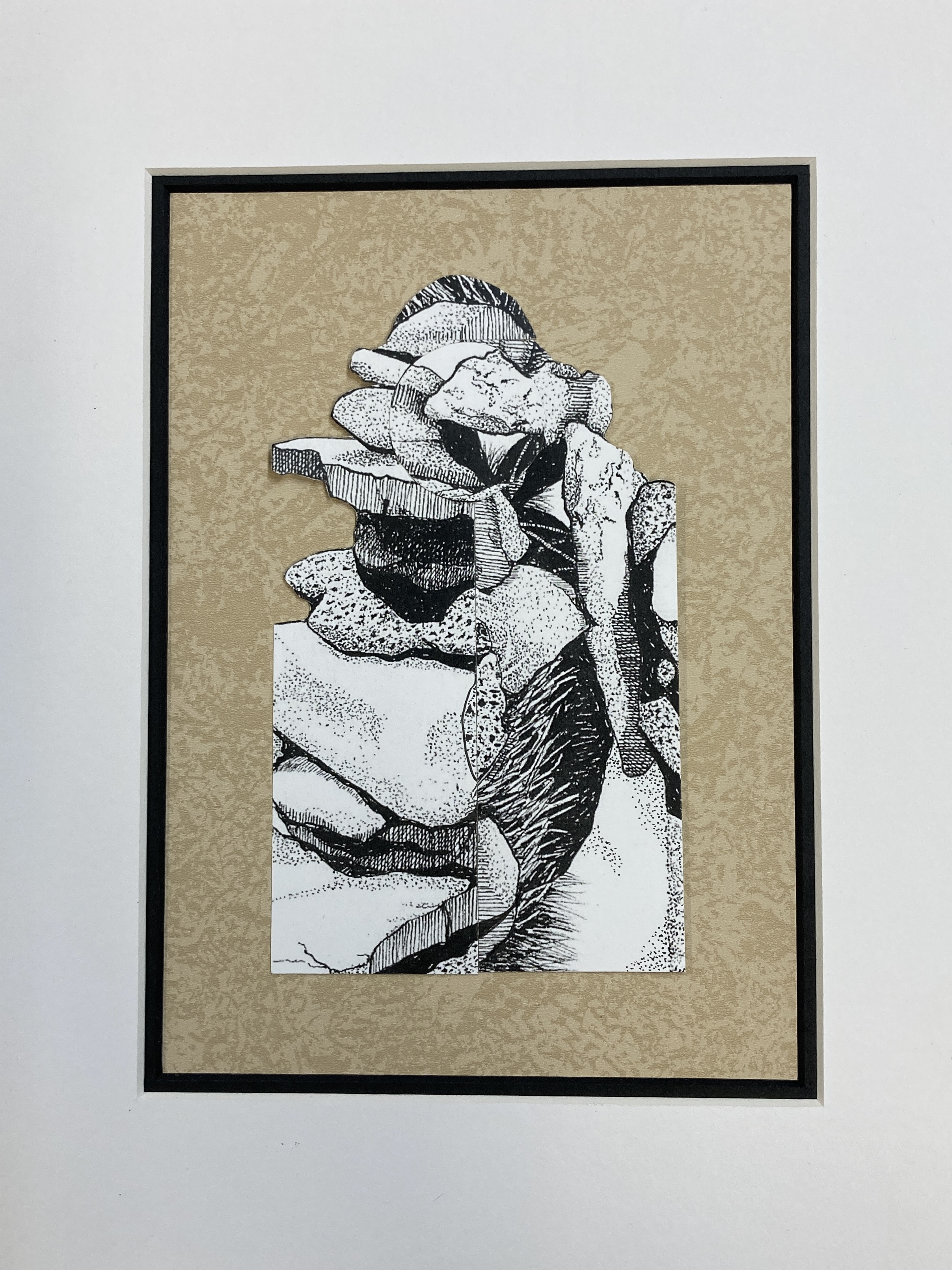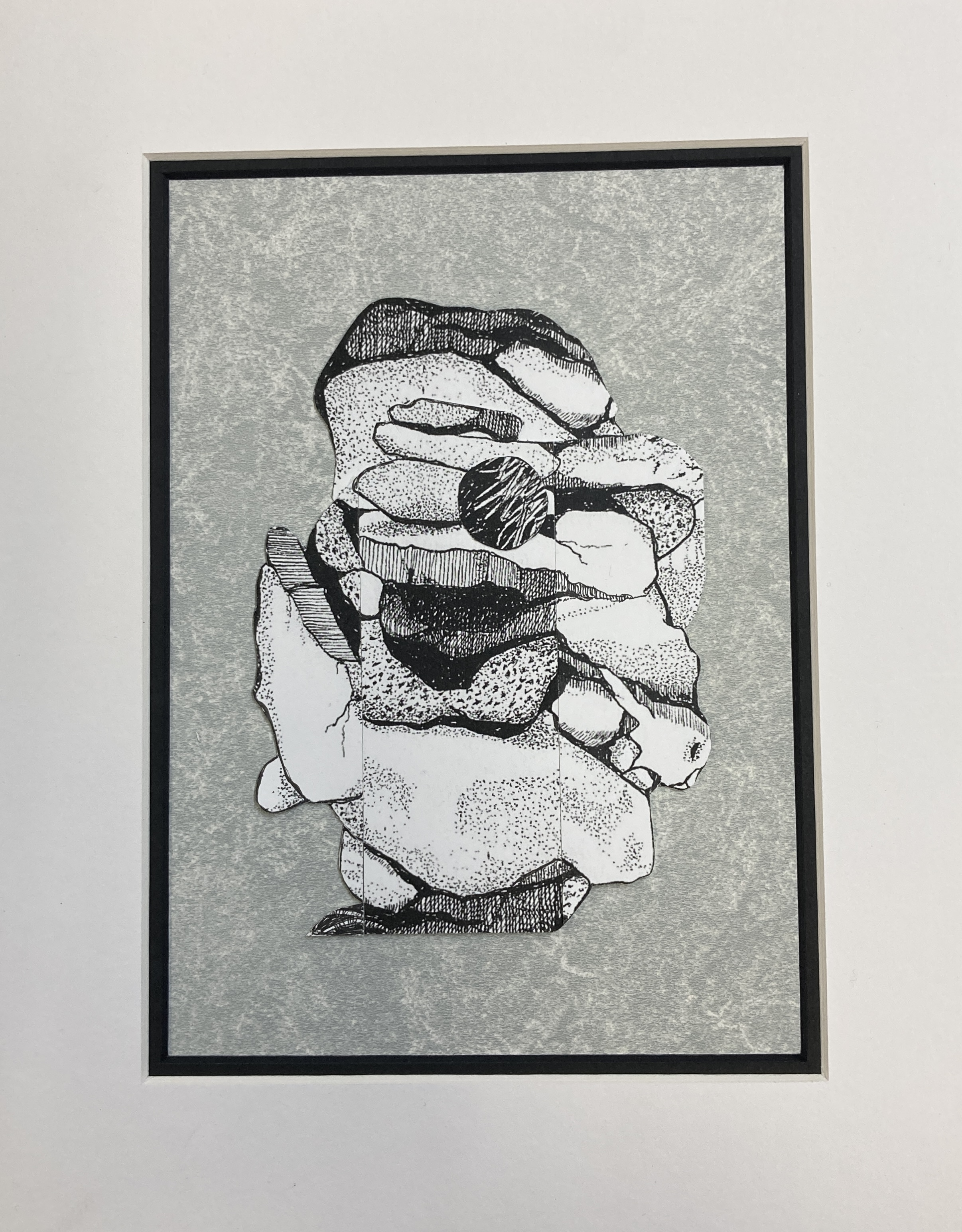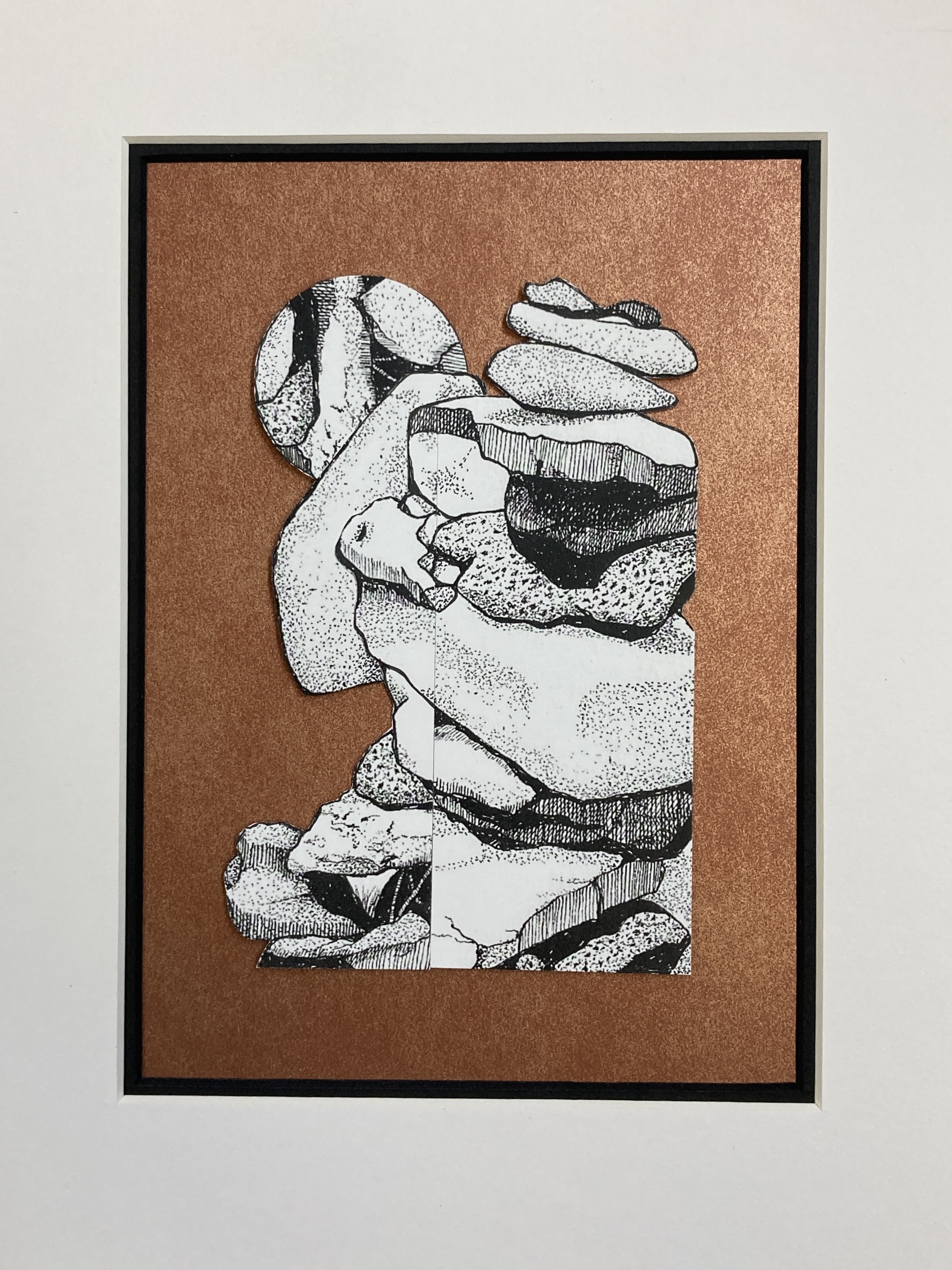 This series was created by taking a drawing I made of an inuksuk (stacked stones), reproducing it, then cutting it apart and reassembling/collaging into new configurations. I then added additional pen and ink drawing. Pure play. Each is matted to 8″x 10″.
