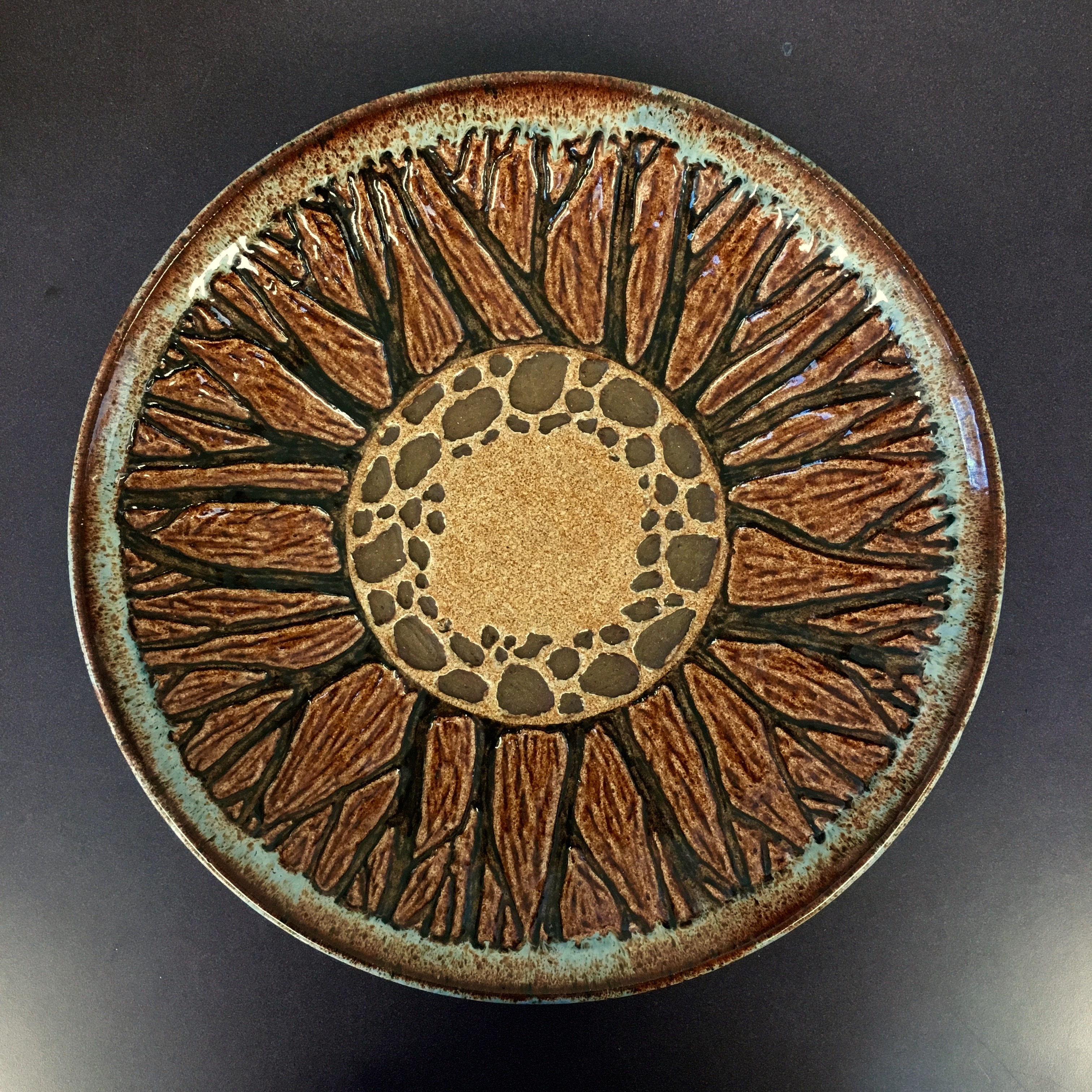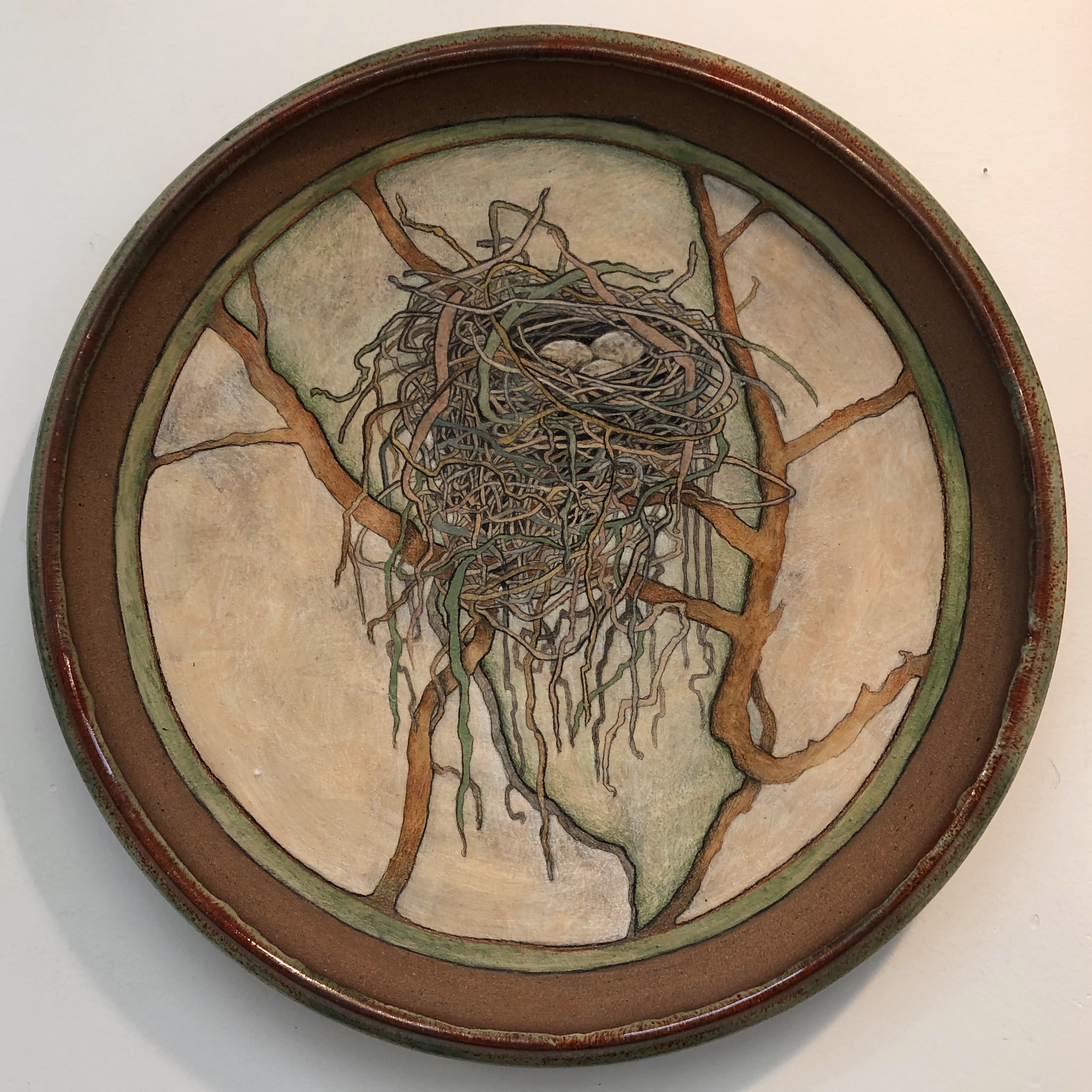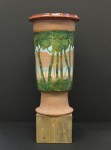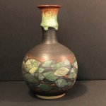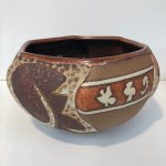 These pieces are collaborations between my neighbor and friend, potter Peder Hegland, and me. Peder throws the pot and turns it over to me. I paint or draw or collage on it if it is fired, or carve into it if it is still leather hard. There are a few more pieces besides what you see here, but I didn’t think to get photos when they were still available.