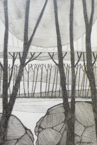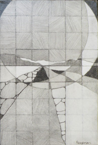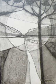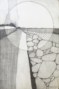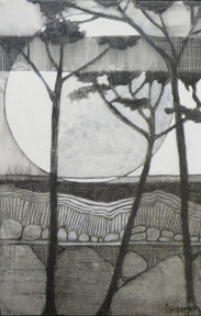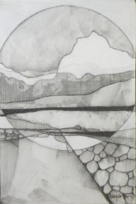 The MOONSCAPE series, black and white pencil and gesso drawings on canvas, are abstracted landscape and moon elements combined to create a monochromatic dreamlike image.