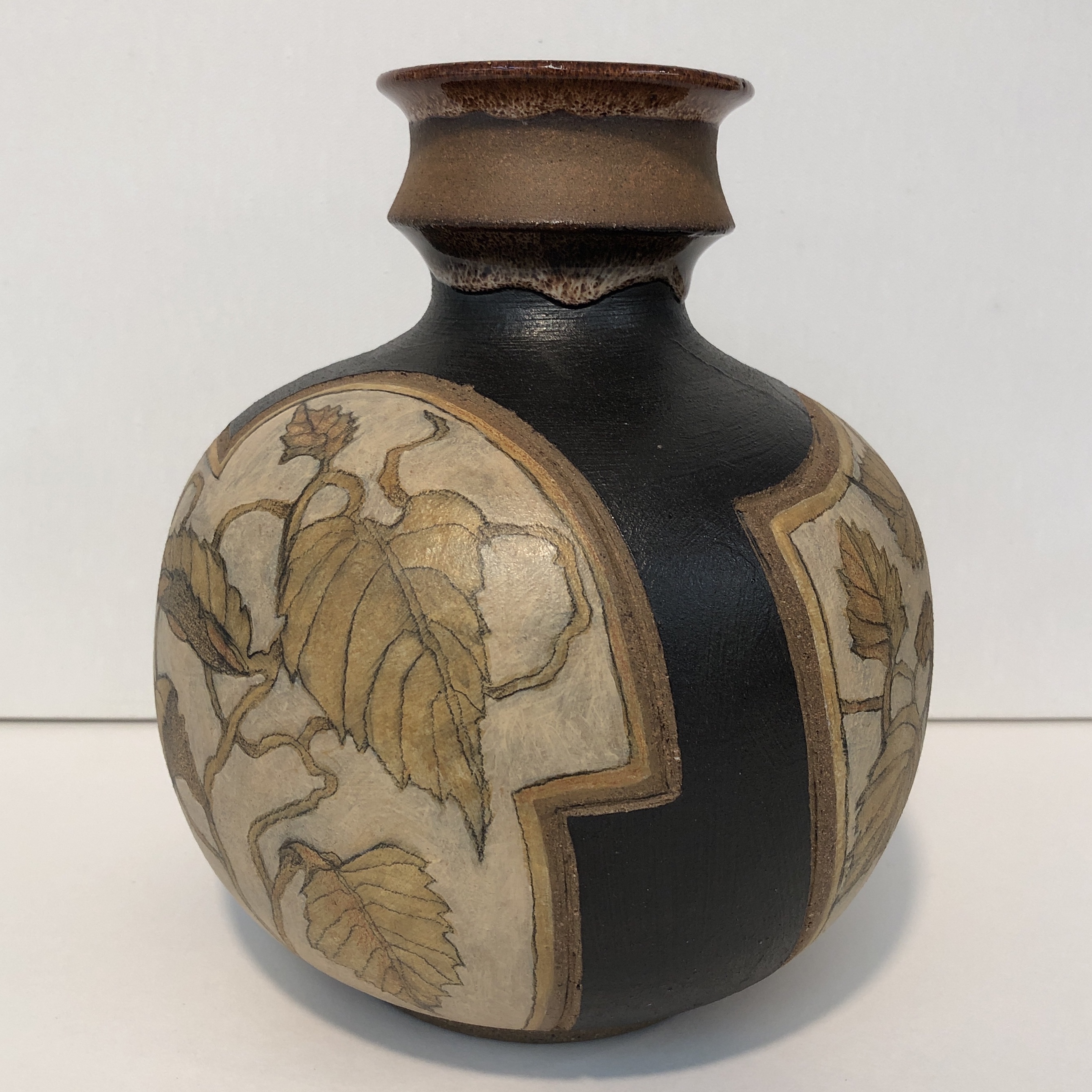 My neighbor and friend, potter Peder Hegland, and I have been having fun doing occasional collaborative pieces. He throws the pot and I either paint/draw on it after it is fired or carve into it before it is bisqued.