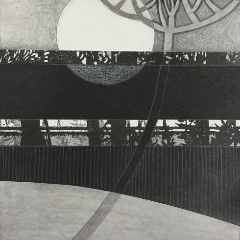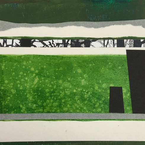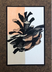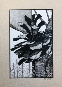 For these pieces, I began with a pen and ink drawing of a pine cone that I collected in the forest here on Pine Point.. I had the drawing reproduced, then cut, pasted, drew on, and reconfigured the elements to create new compositions on 5″x 7″ boards. Very fun and very relaxing.